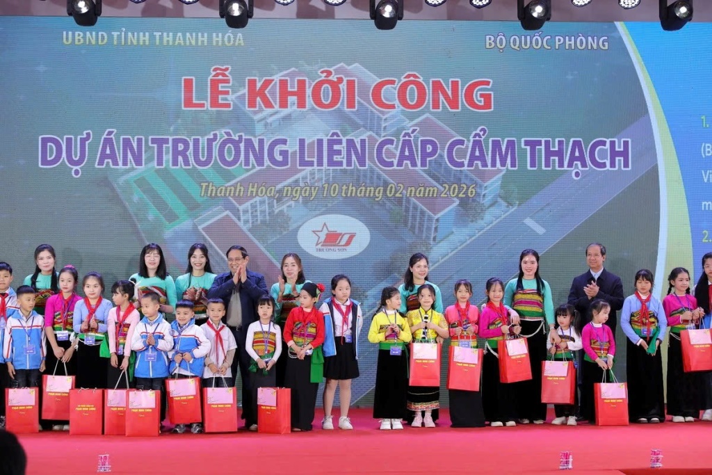 Ngày 10/02/2026, tại xã Cẩm Thạch, tỉnh Thanh Hoá; Thủ tướng Phạm Minh Chính đã dự lễ khởi công dự án Trường Liên cấp Cẩm Thạch và thăm, tặng quà Tết cho hộ nghèo, hộ có hoàn cảnh khó khăn, công nhân lao động trên địa bàn tỉnh Thanh Hóa.
